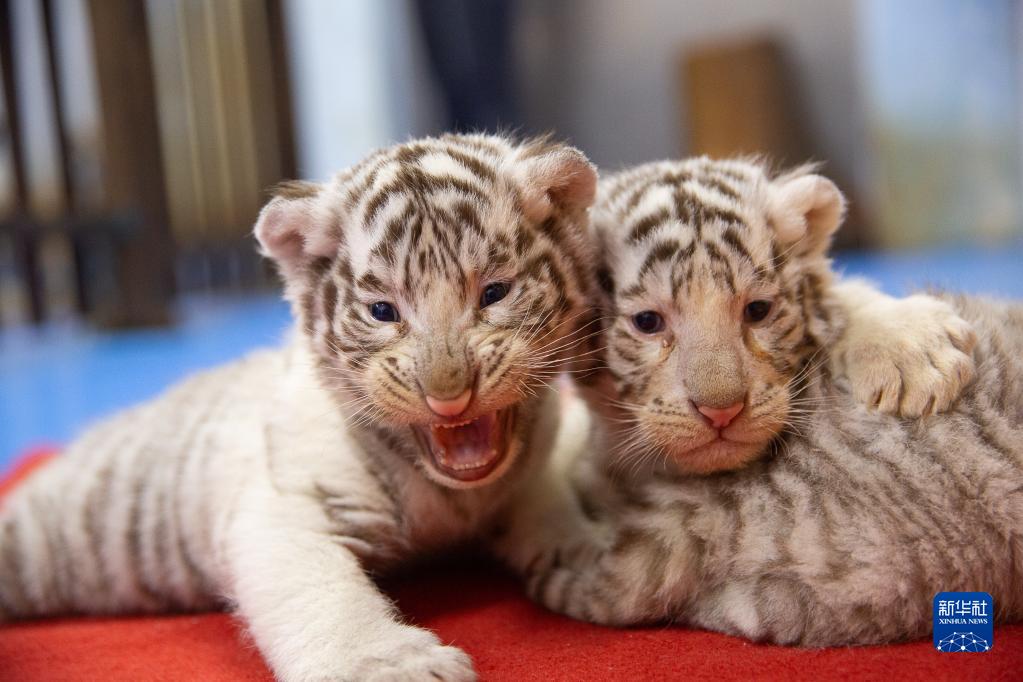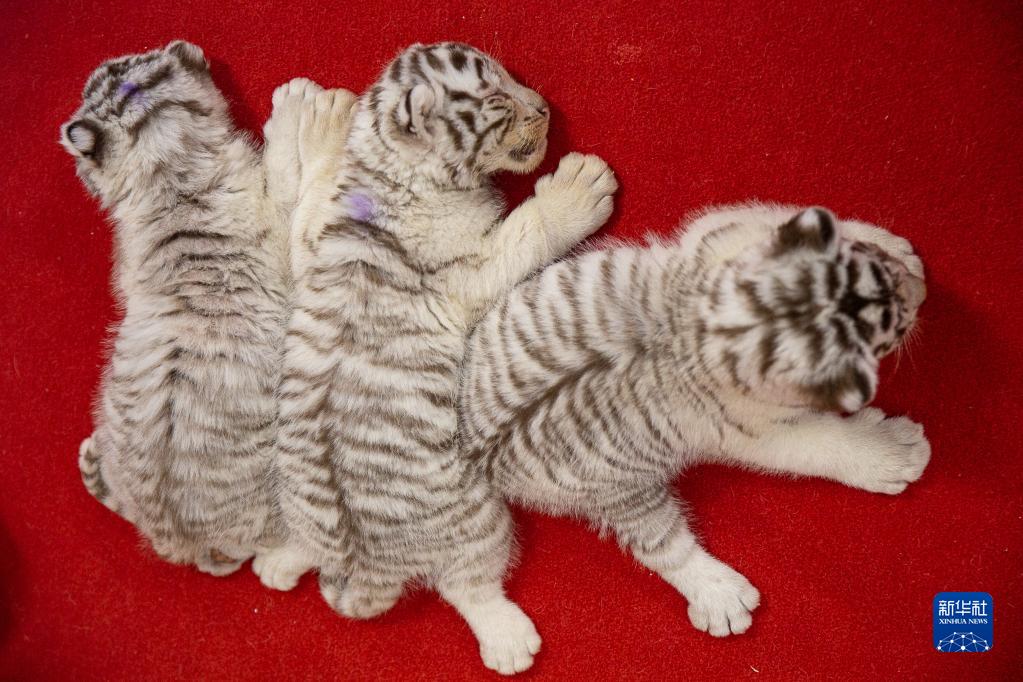 当日,浙江省湖州市长兴太湖龙之梦动物园已满月的三只白虎幼崽正式与游客见面,为虎年新春增添节日气氛。