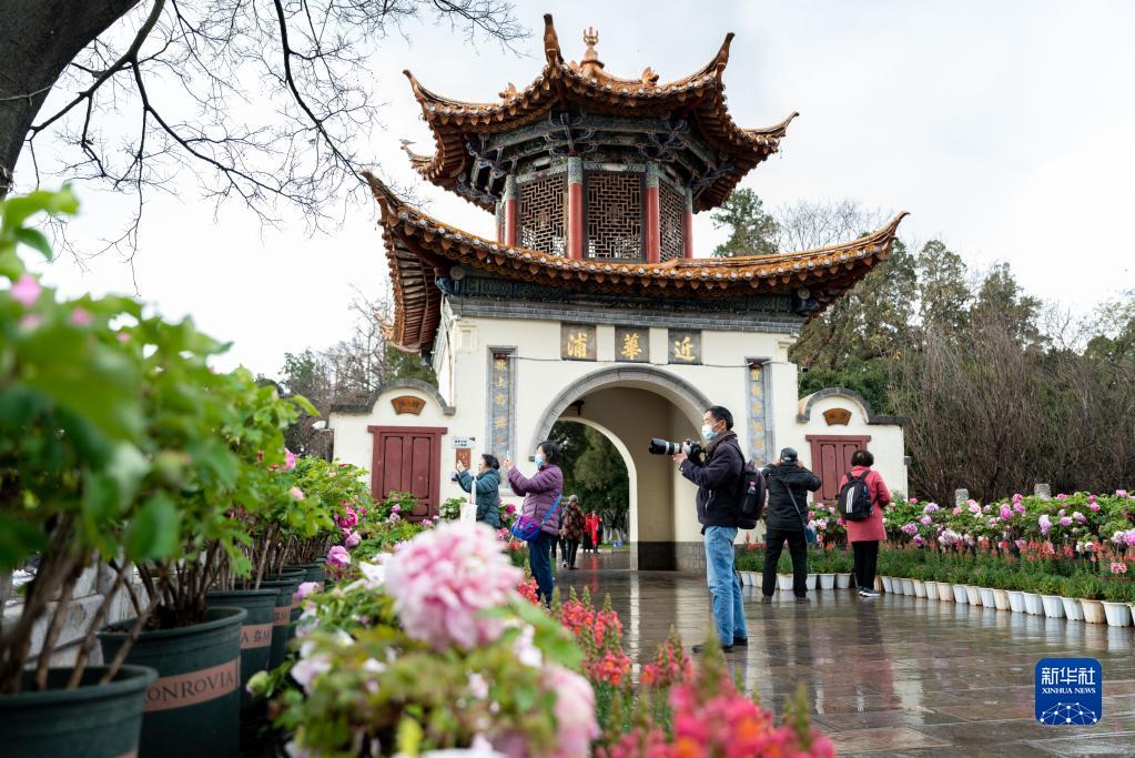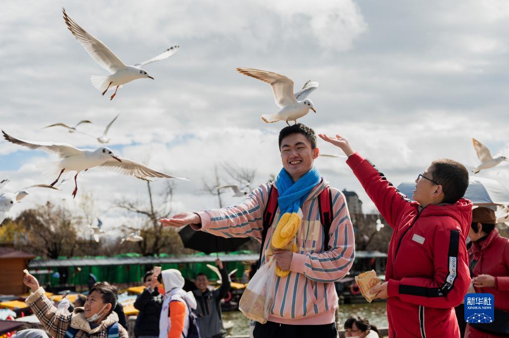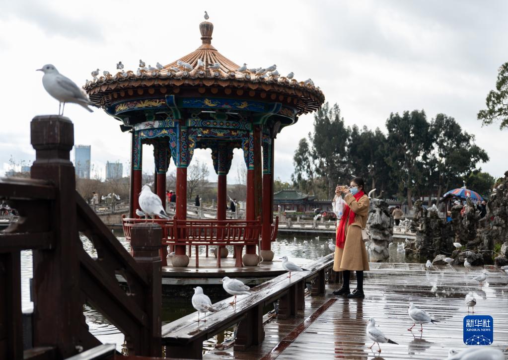 当日是大年初六,游客来到昆明市大观公园游览,欢度春节假期。
