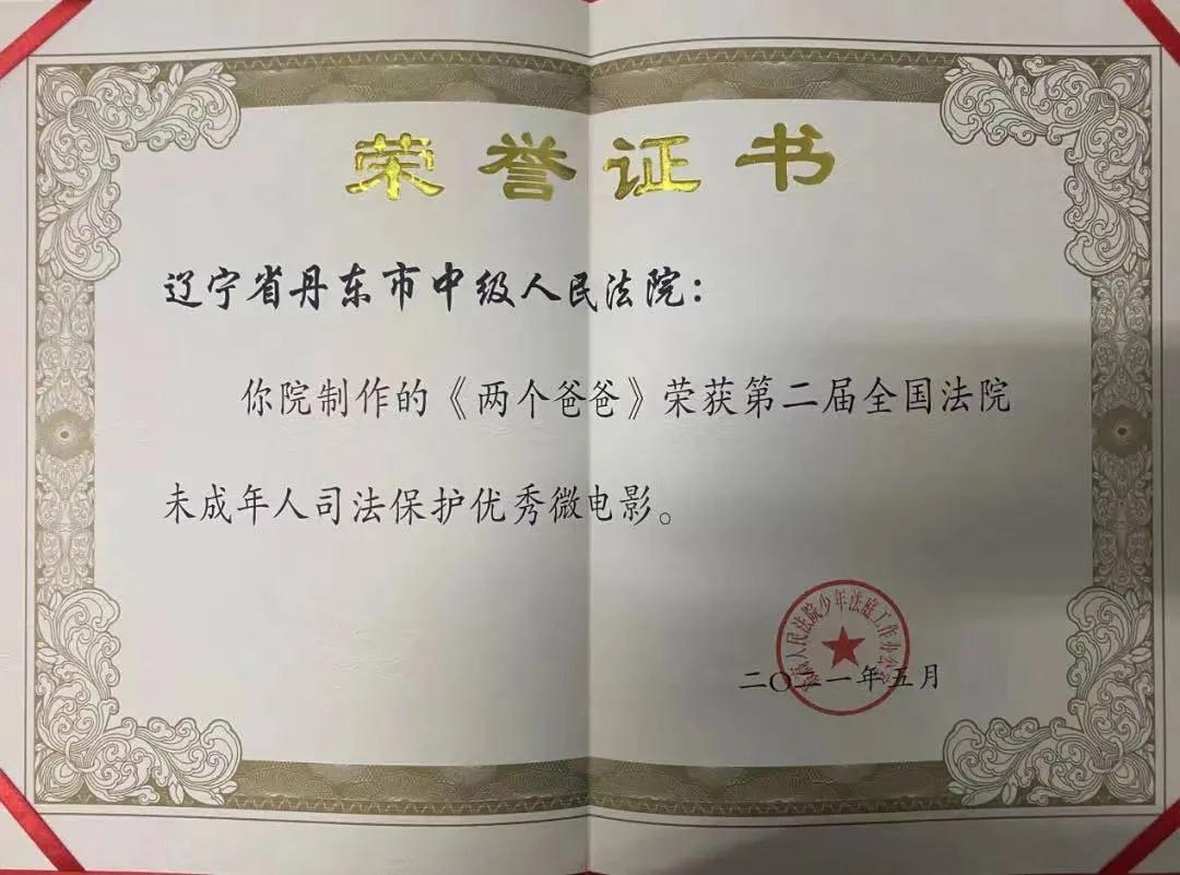 近日,丹东市中级人民法院联合丹东报业传媒发展有限公司共同制作的微电影《两个爸爸》,获得由最高人民法院少年法庭工作办公室颁发的“第二届全国法院未成年人司法保护优秀微电影”奖。