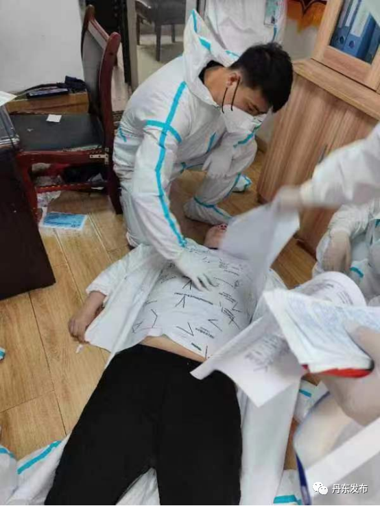 4月30日中午,福春三社区的一名志愿者突然晕倒,其他志愿者赶紧将他扶到社区办公室躺平,并撕开他的防护服,帮他扇风、散热。