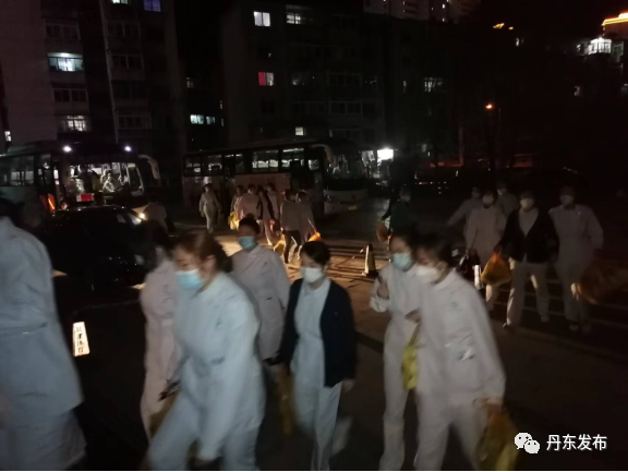 5月2日6时30分,东港市第七批43名医务人员赶赴丹东方舱医院和振兴区隔离点。