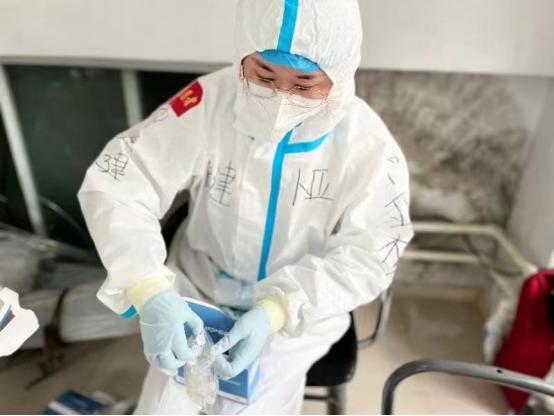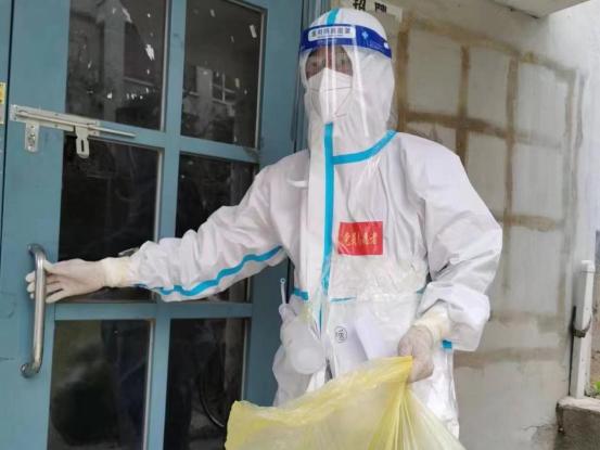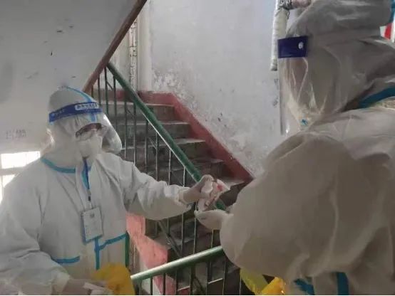 宁京刚曾是武警,张成瑶是健身爱好者,二人体能不错,工作中不讲条件,也从不喊苦喊累。小区属于封控区,他们配合医护人员逐户进行核酸检测或发放抗原检测试剂盒,并做好楼道消杀。穿着防护服,戴着N95口罩和隔离面屏,一个单元楼做下来大汗淋漓,而他们每天要爬十几个单元楼。