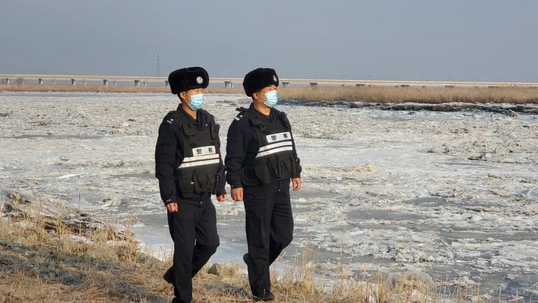 第二天一大早,我们早早出发,走在满是浮冰的土路上,跟随民警巡逻的脚步,开始了新一天的采访工作。巡边是一件枯燥又极其考验耐性的工作,一路上,民警们在认真巡逻执勤的同时,还不时暖心地与百姓交流处理突发警情。