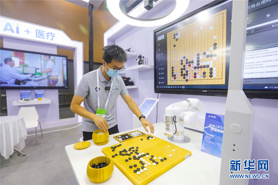 图为工作人员向观众展示智能机器人在围棋领域的应用。新华网夏铭阳摄