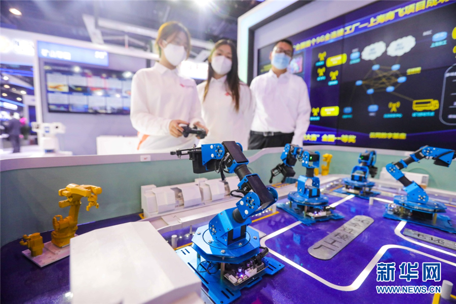 图为工作人员利用5G网络连接机械臂进行实体操作。新华网夏铭阳摄